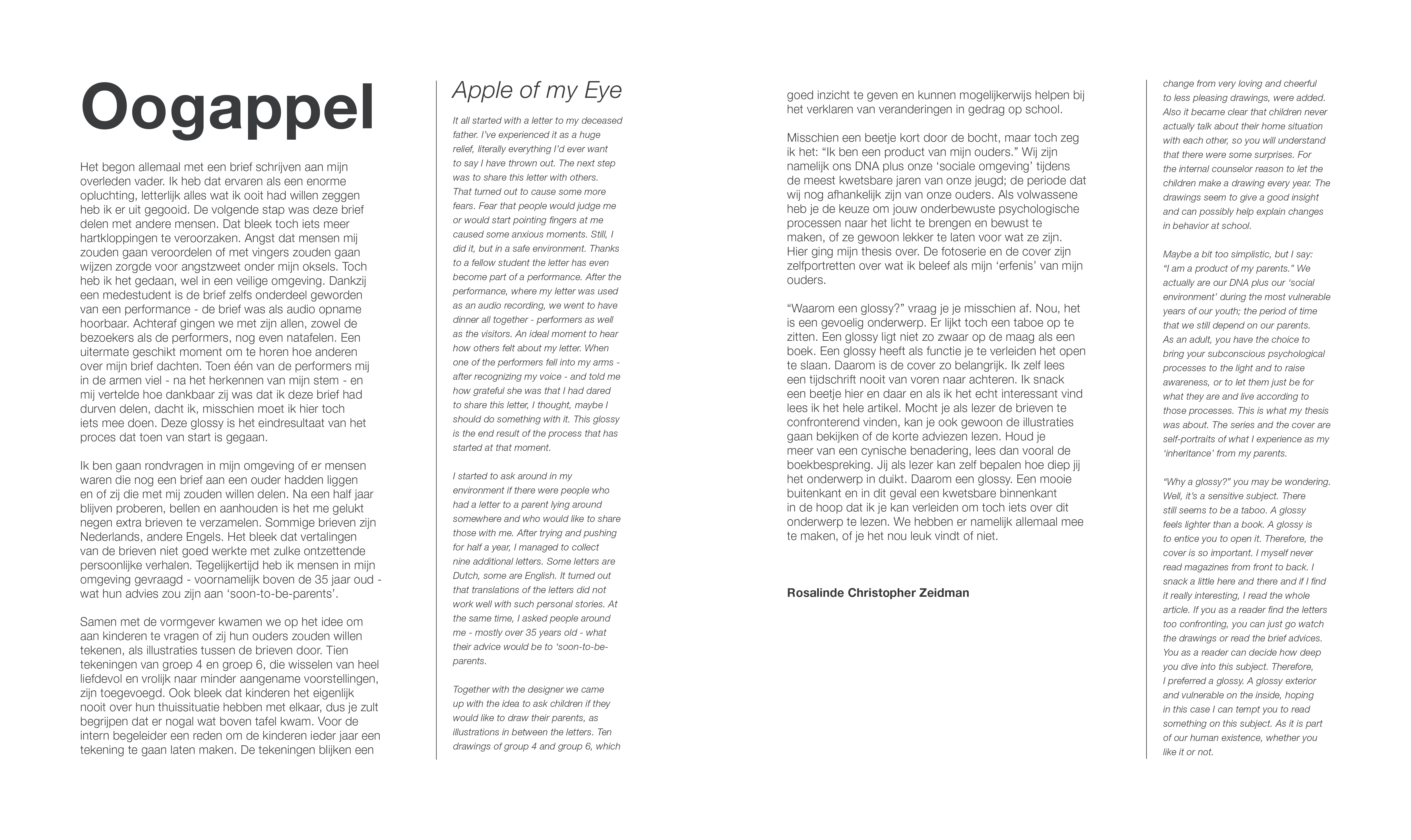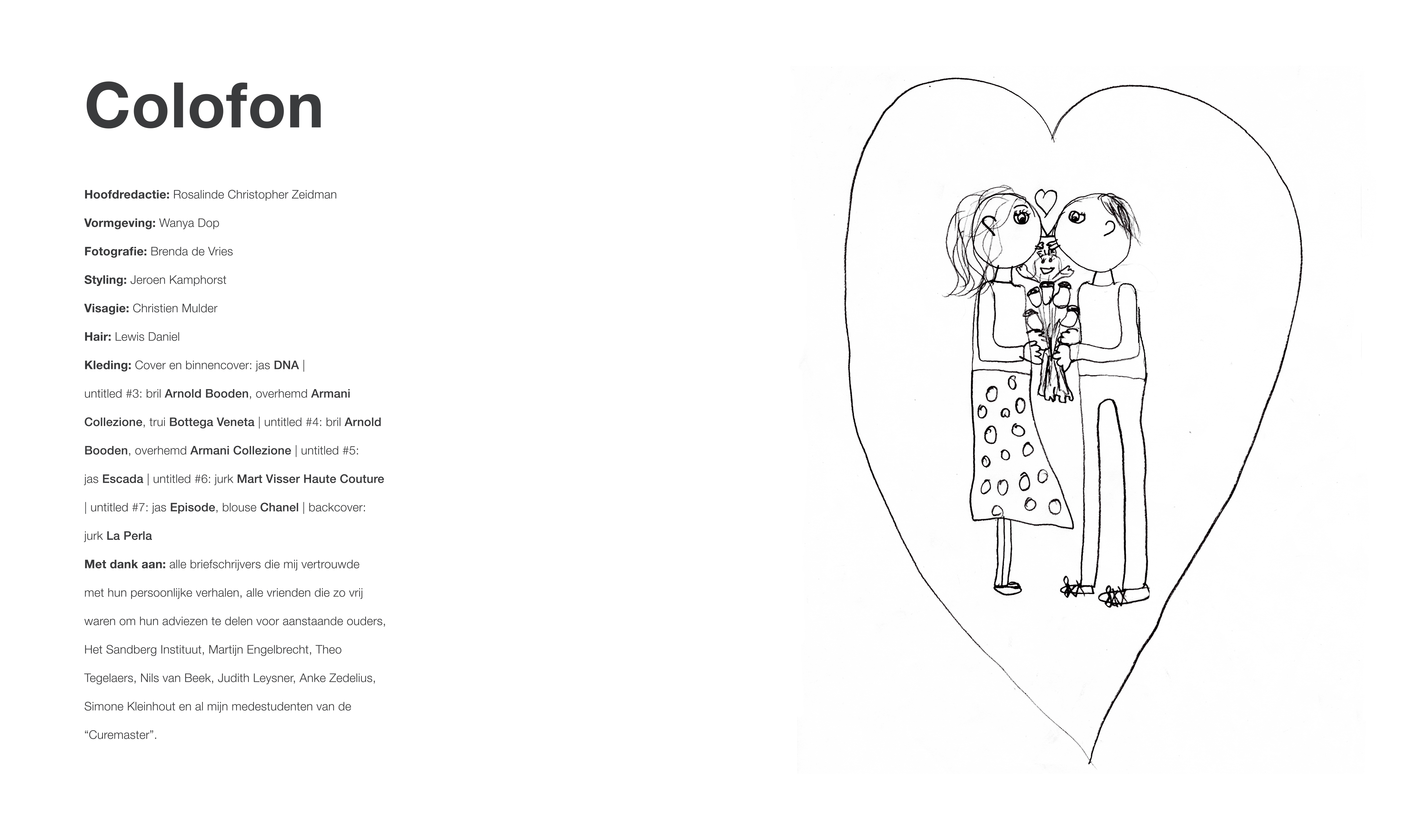 still seems to be a taboo. A glossy feels lighter than a book. A glossy is to entice you to open it. Therefore, the cover is so important. I myself never read magazines from front to back. I snack a little here and there and if I find it really interesting, I read the whole article. If you as a reader find the letters too confronting, you can just go watch the drawings or read the brief advices. You as a reader can decide how deep you dive into this subject. Therefore, I preferred a glossy. A glossy exterior and vulnerable on the inside, hoping in this case I can tempt you to read something on this subject. As it is part of our human existence, whether you like it or not.