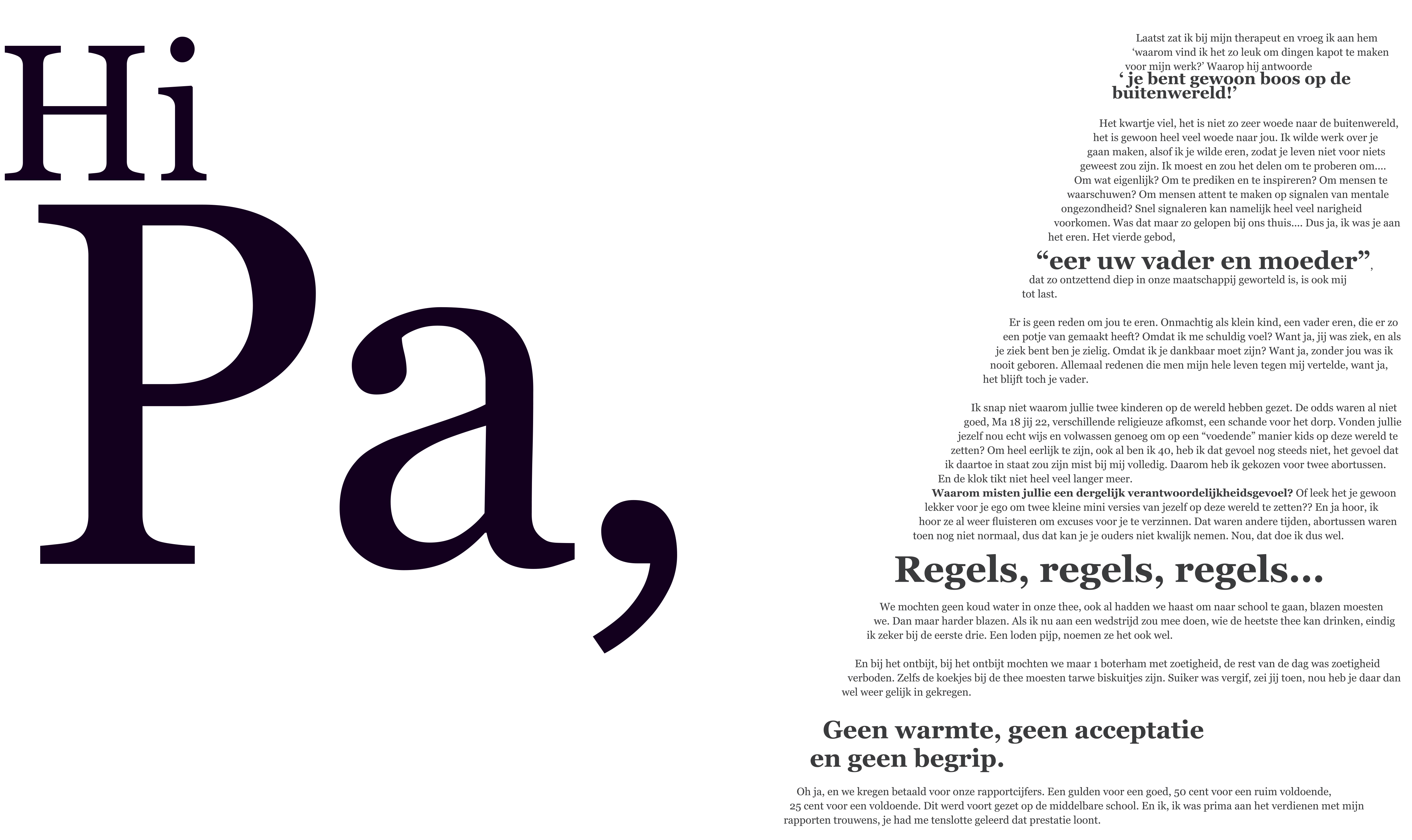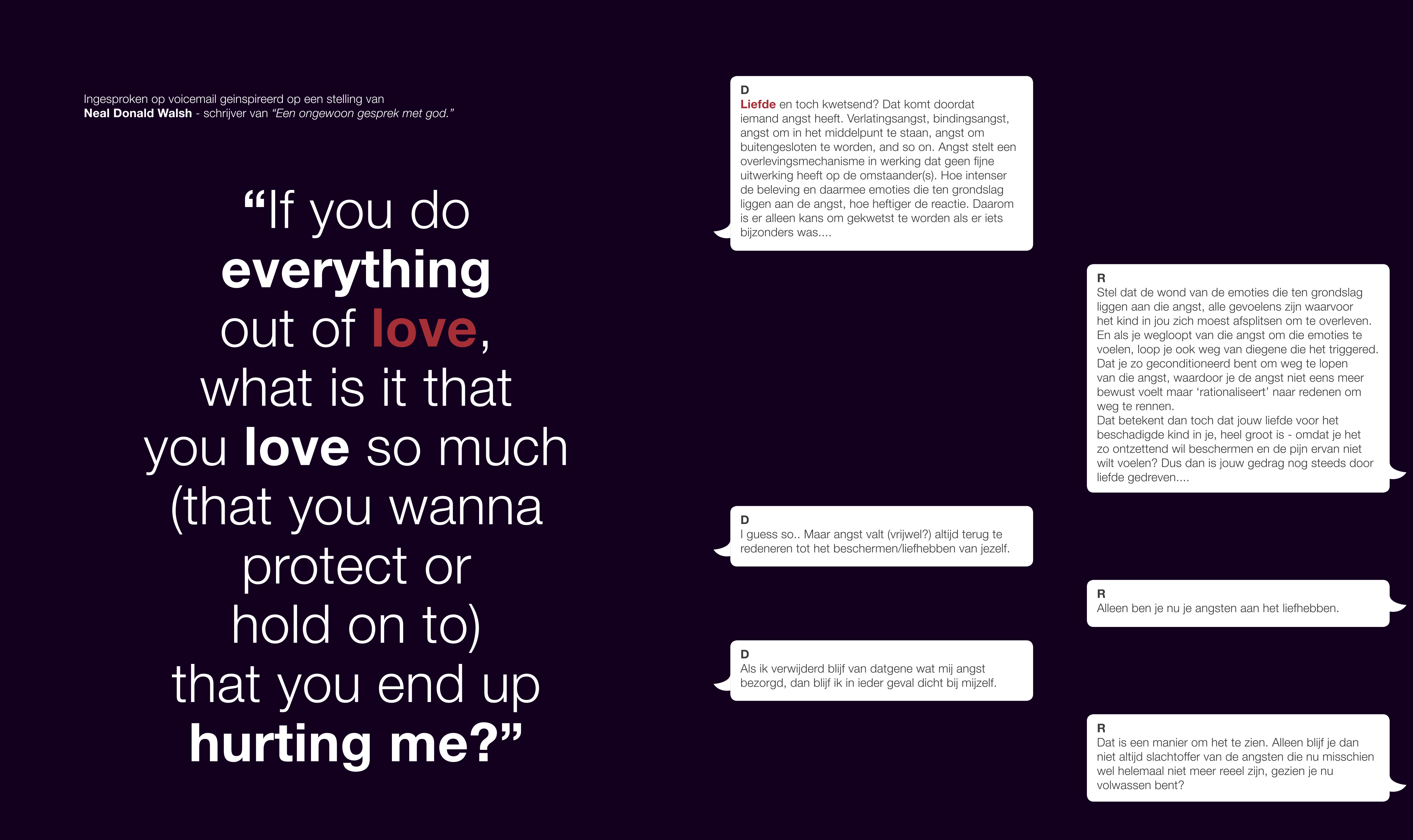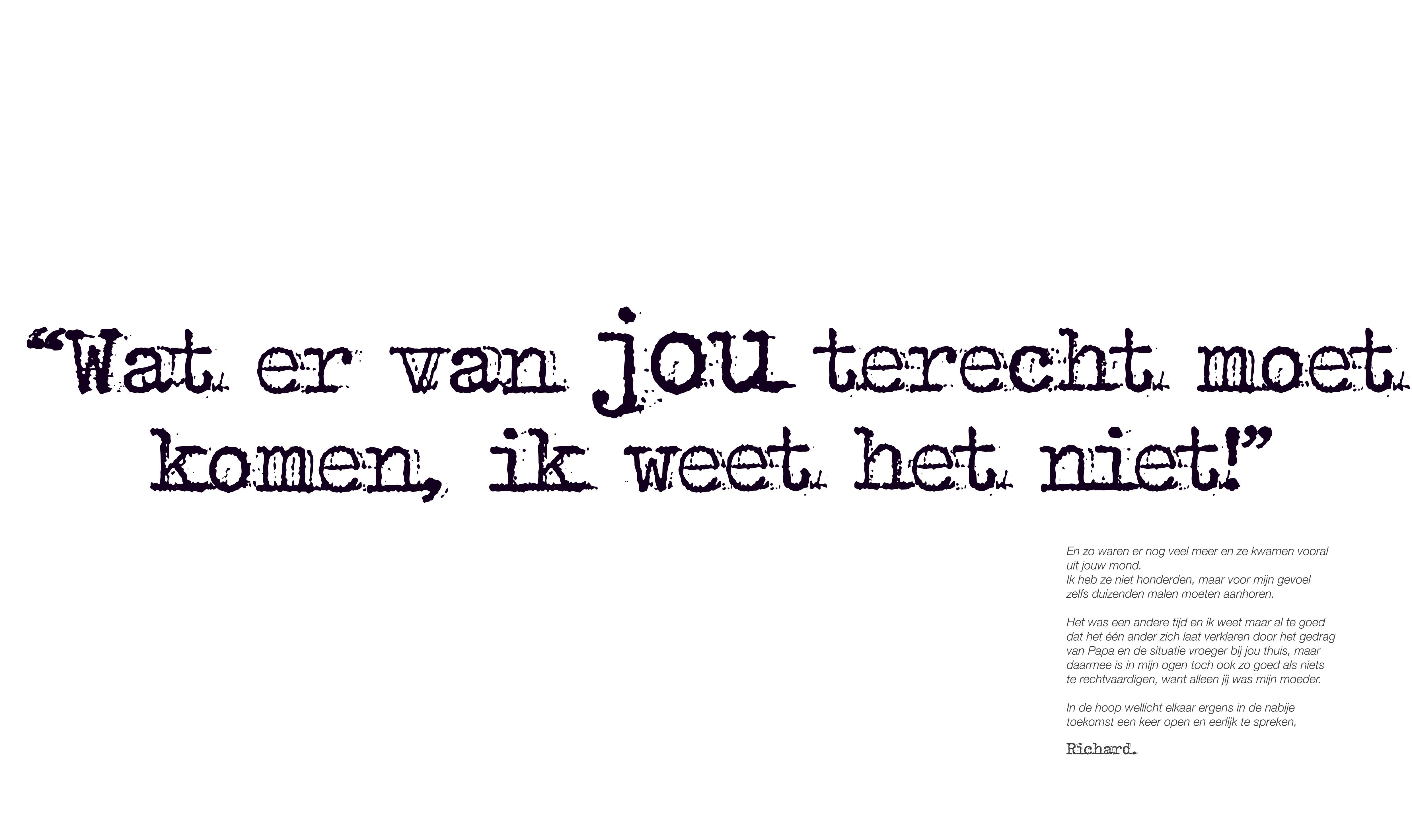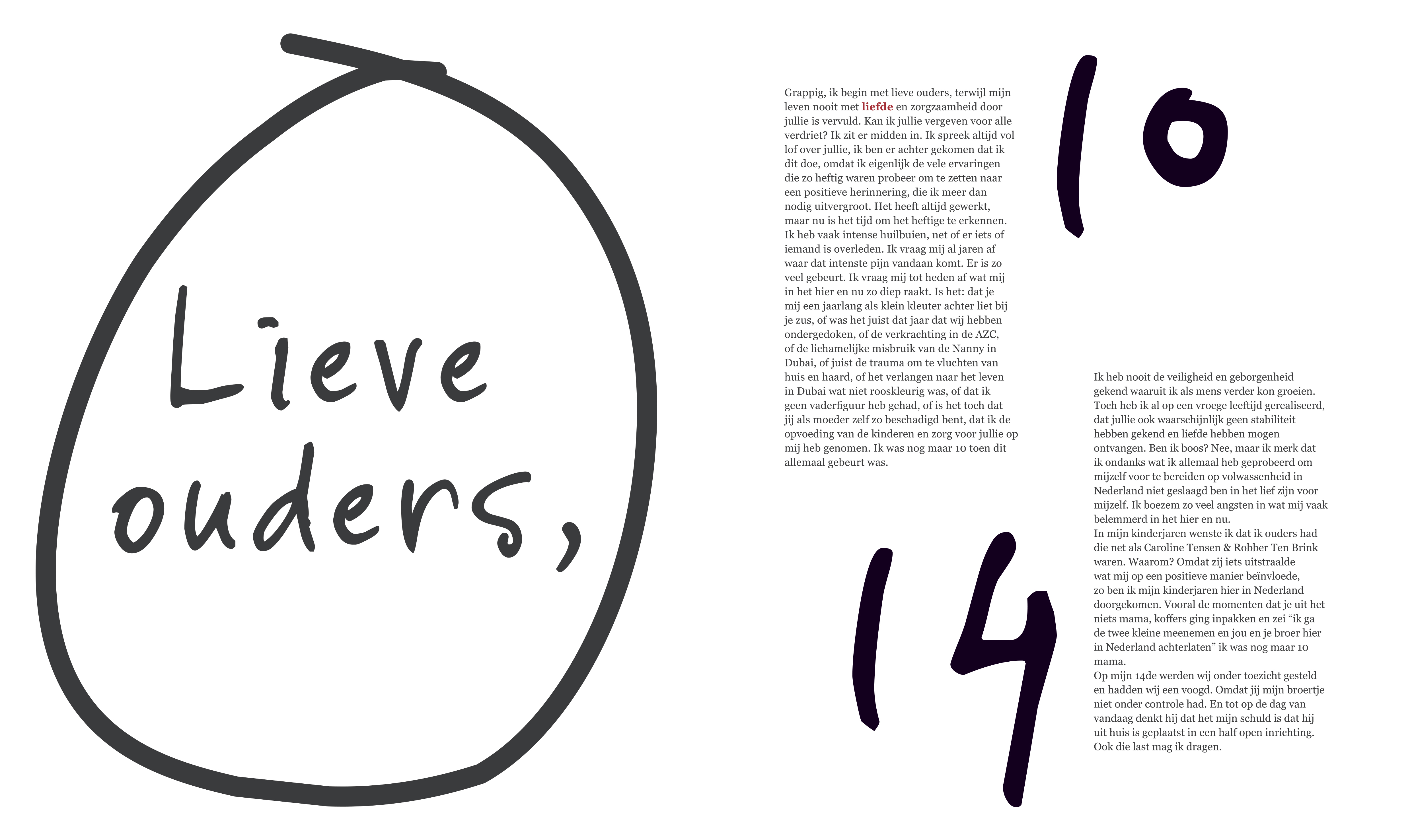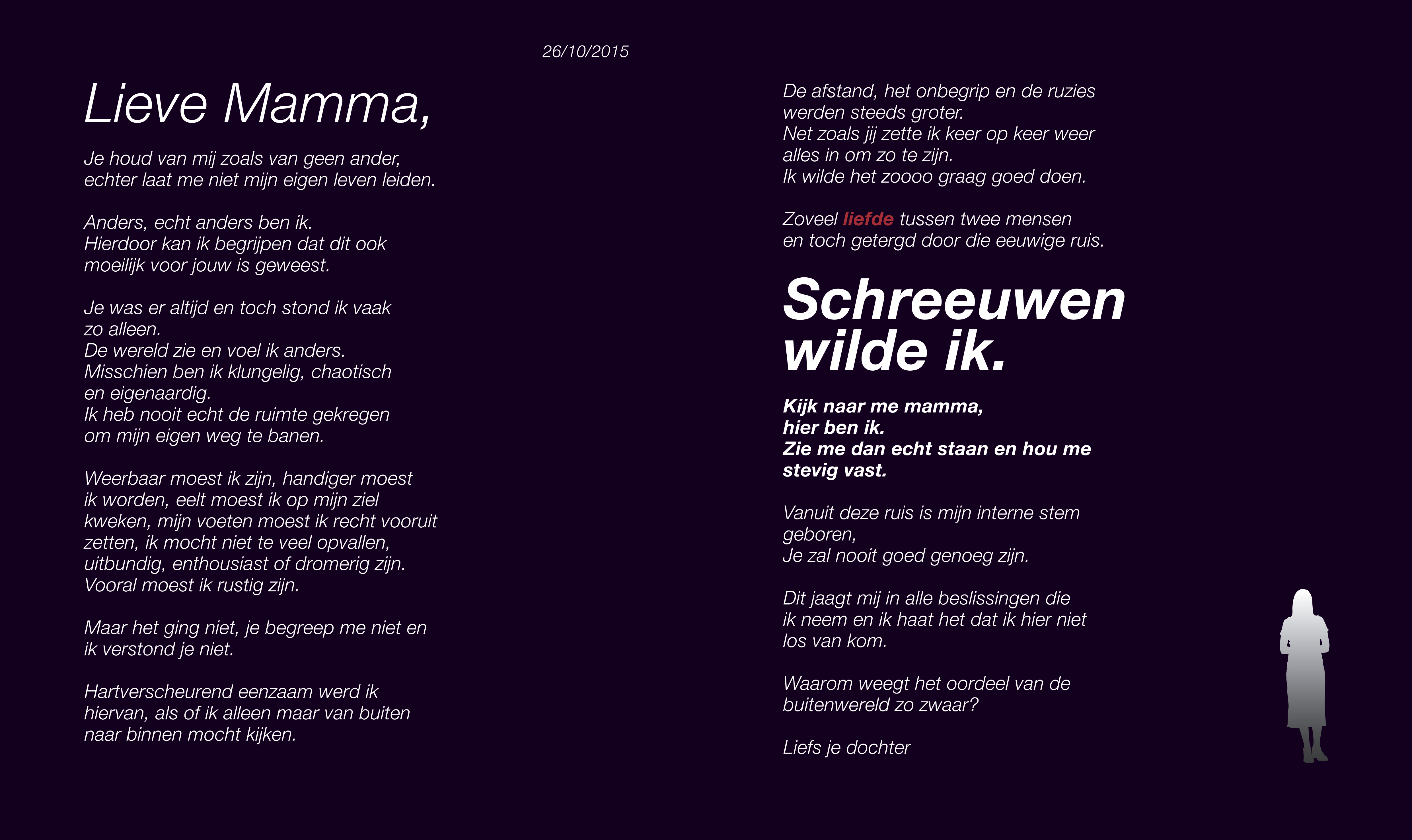That turned out to cause some more fears. Fear that people would judge me or would start pointing fingers at me caused some anxious moments. Still, I did it, but in a safe environment. Thanks to a fellow student the letter has even become part of a performance. After the performance, where my letter was used as an audio recording, we went to have dinner all together – performers as well as the visitors. An ideal moment to hear how others felt about my letter. When one of the performers fell into my arms – after recognizing my voice – and told me how grateful she was that I had dared to share this letter, I thought, maybe I should do something with it. This glossy is the end result of the process that has started at that moment.