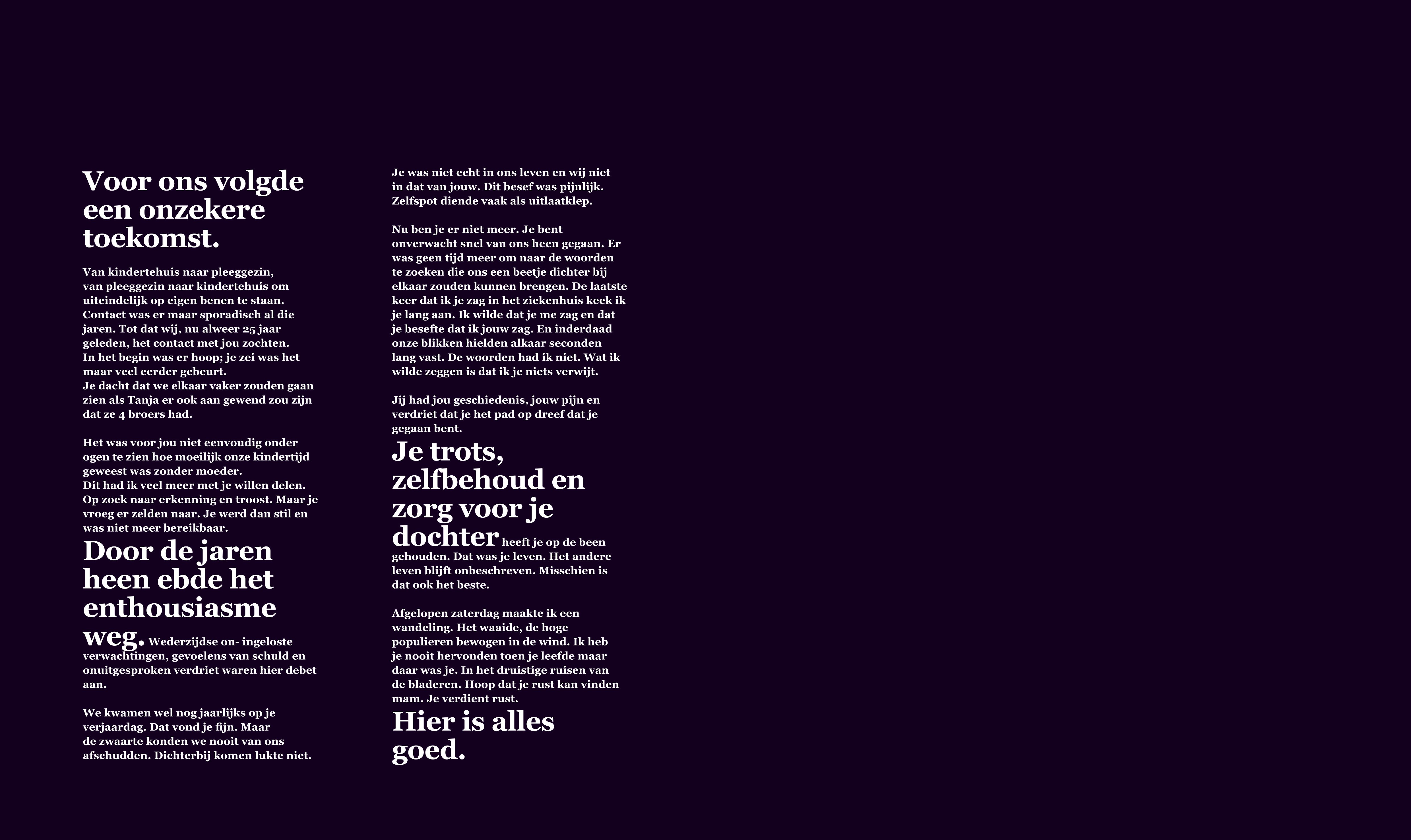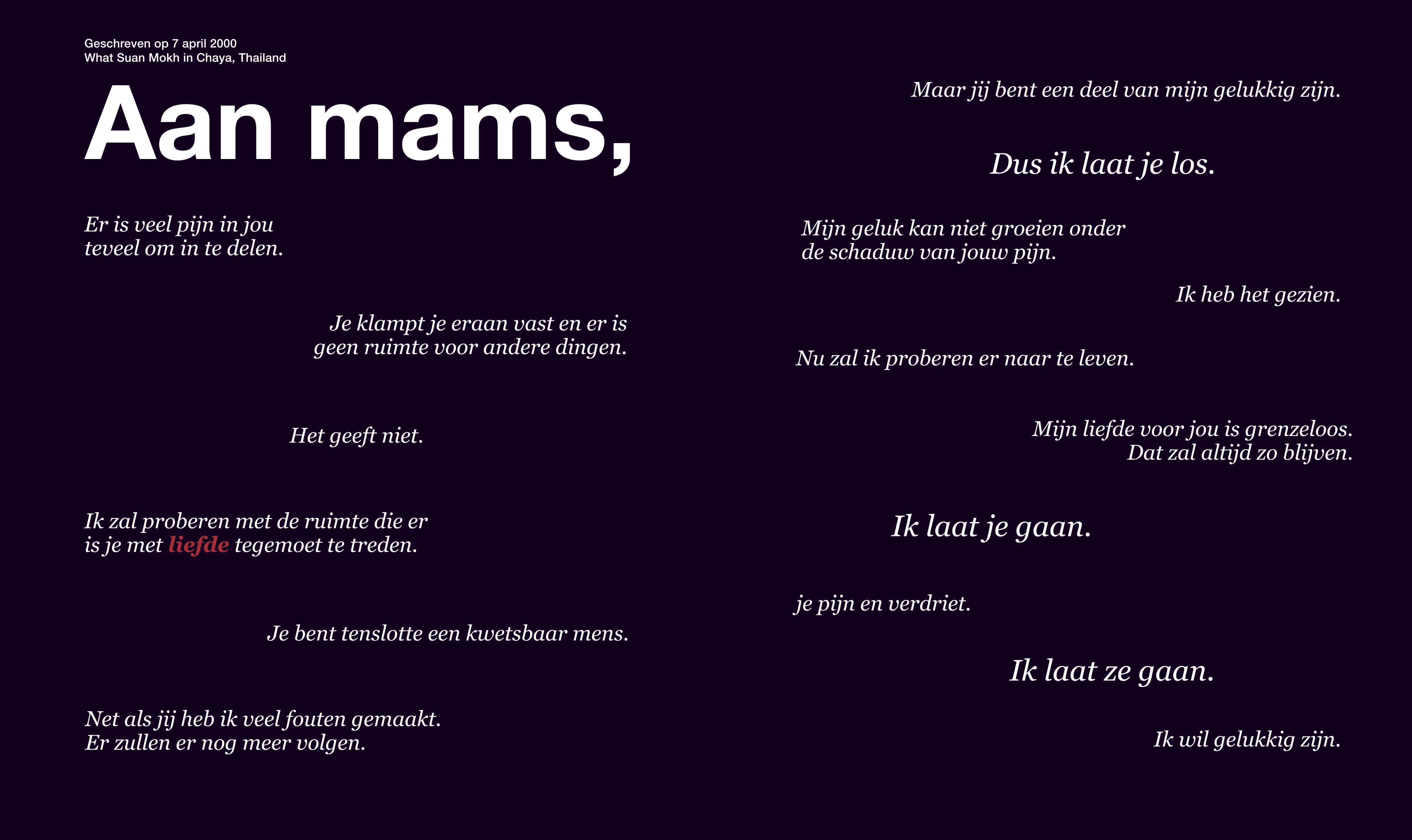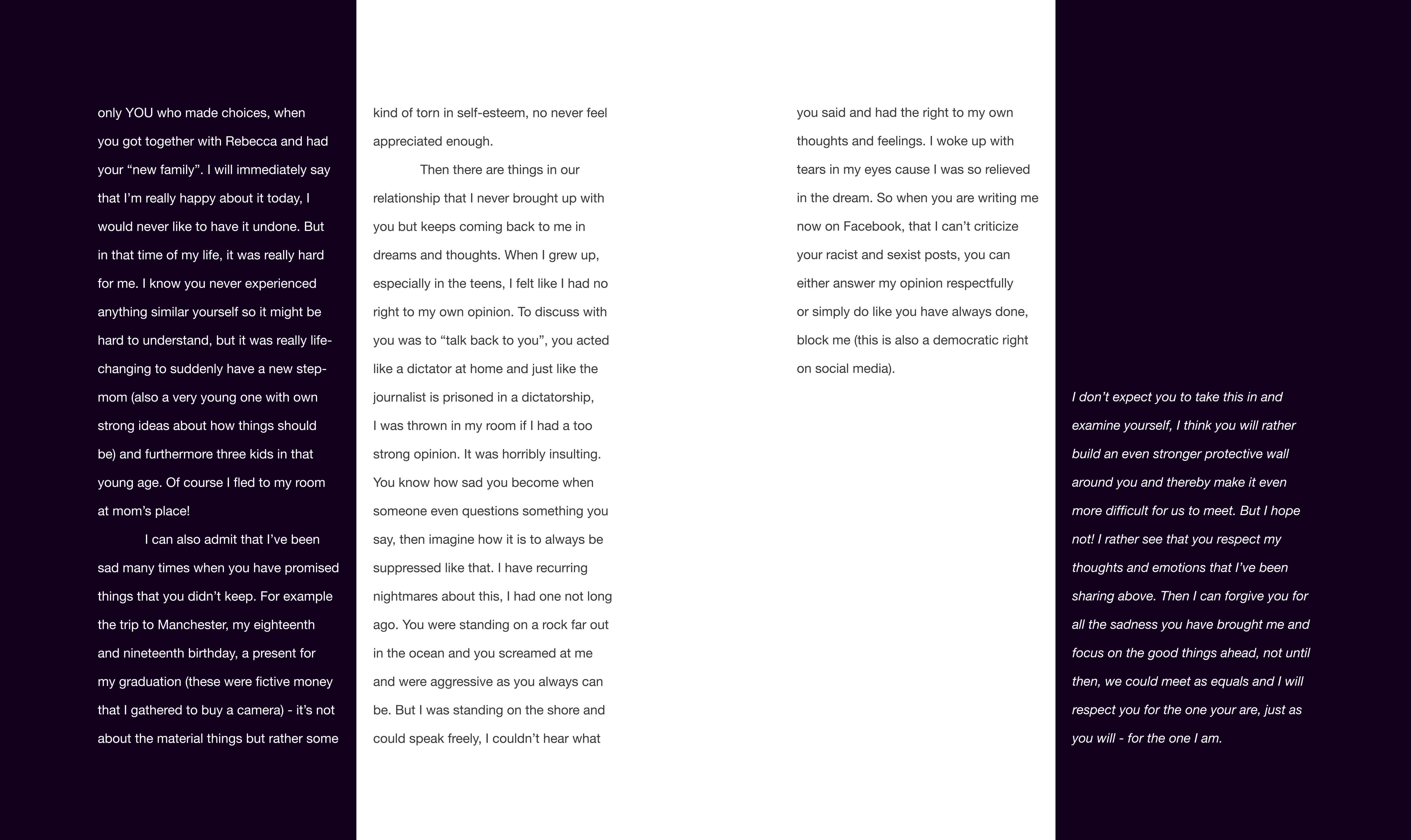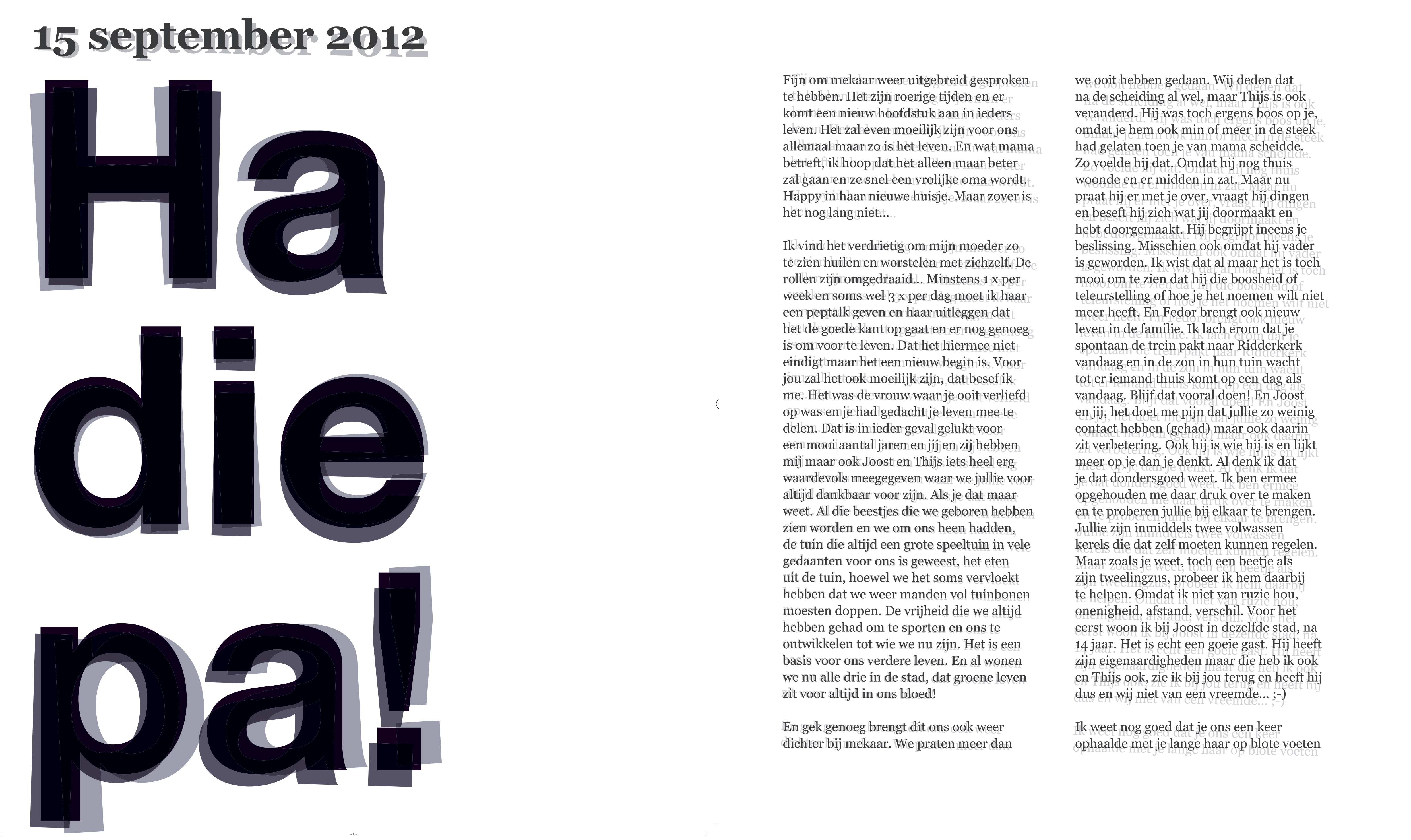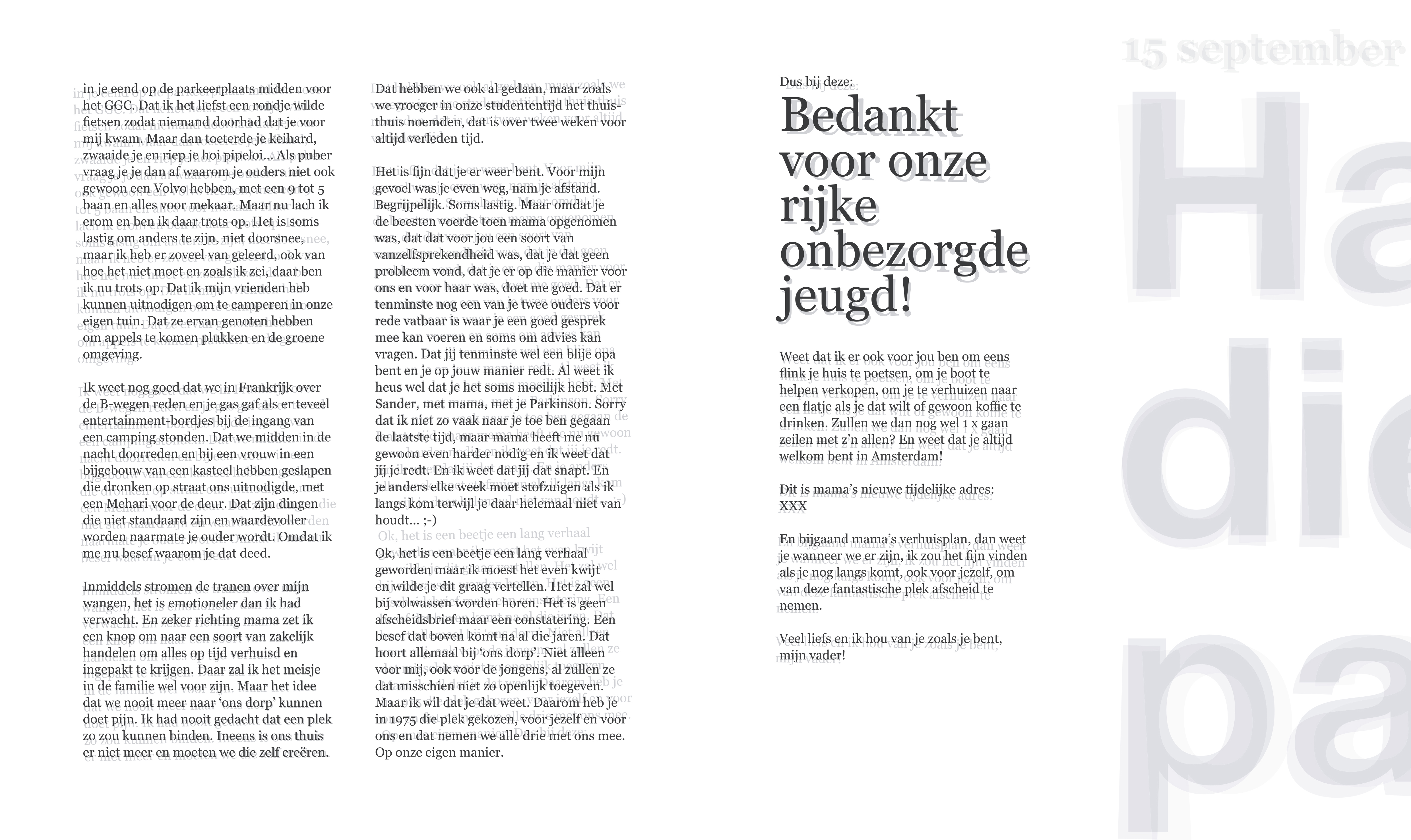 That turned out to cause some more fears. Fear that people would judge me or would start pointing fingers at me caused some anxious moments. Still, I did it, but in a safe environment. Thanks to a fellow student the letter has even become part of a performance. After the performance, where my letter was used as an audio recording, we went to have dinner all together – performers as well as the visitors. An ideal moment to hear how others felt about my letter. When one of the performers fell into my arms – after recognizing my voice – and told me how grateful she was that I had dared to share this letter, I thought, maybe I should do something with it. This glossy is the end result of the process that has started at that moment.