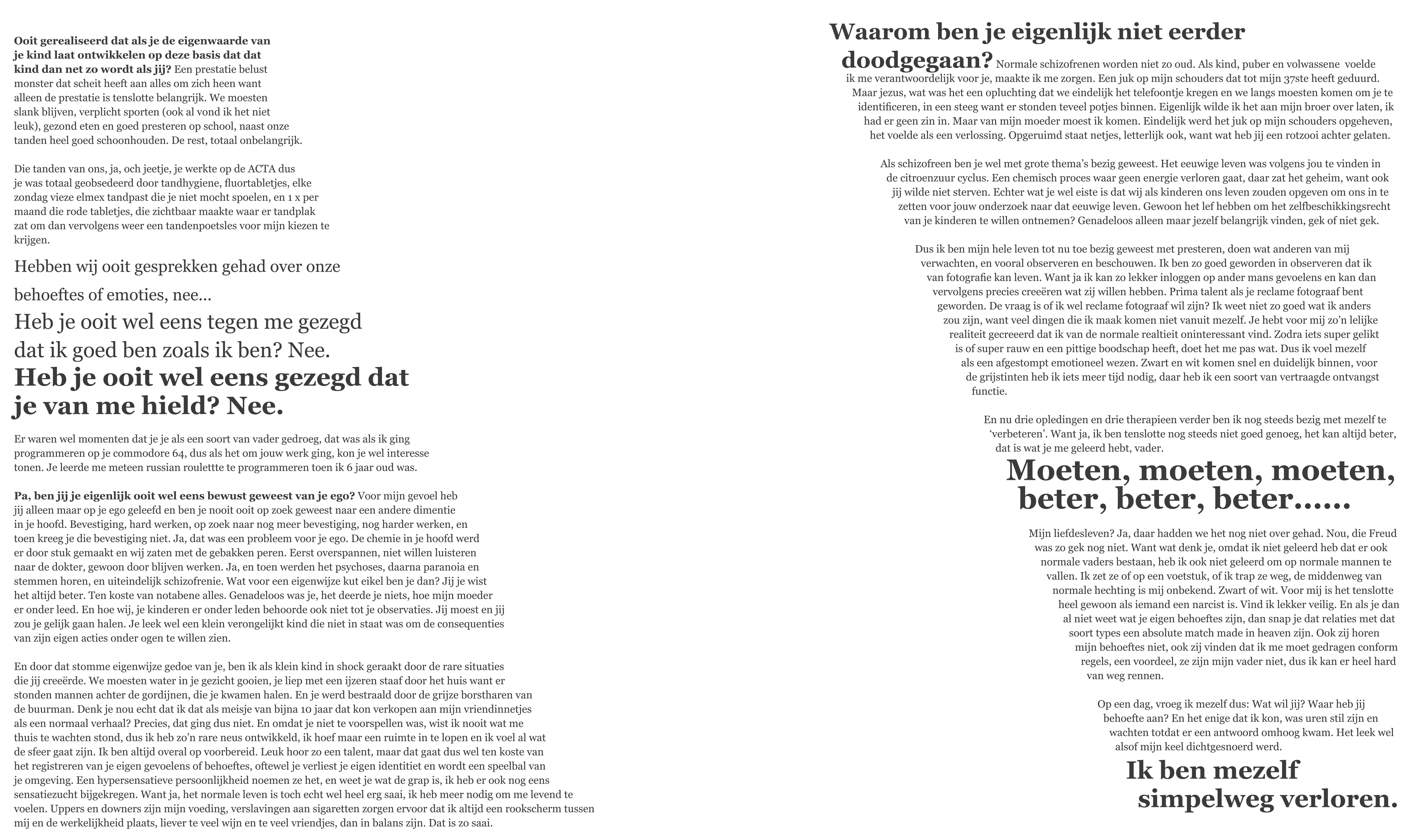 “I am a product of my parents.” We actually are our DNA plus our ‘social environment’ during the most vulnerable years of our youth; the period of time that we still depend on our parents. As an adult, you have the choice to bring your subconscious psychological processes to the light and to raise awareness, or to let them just be for what they are and live according to those processes. This is what my thesis was about. The series and the cover are self-portraits of what I experience as my ‘inheritance’ from my parents.