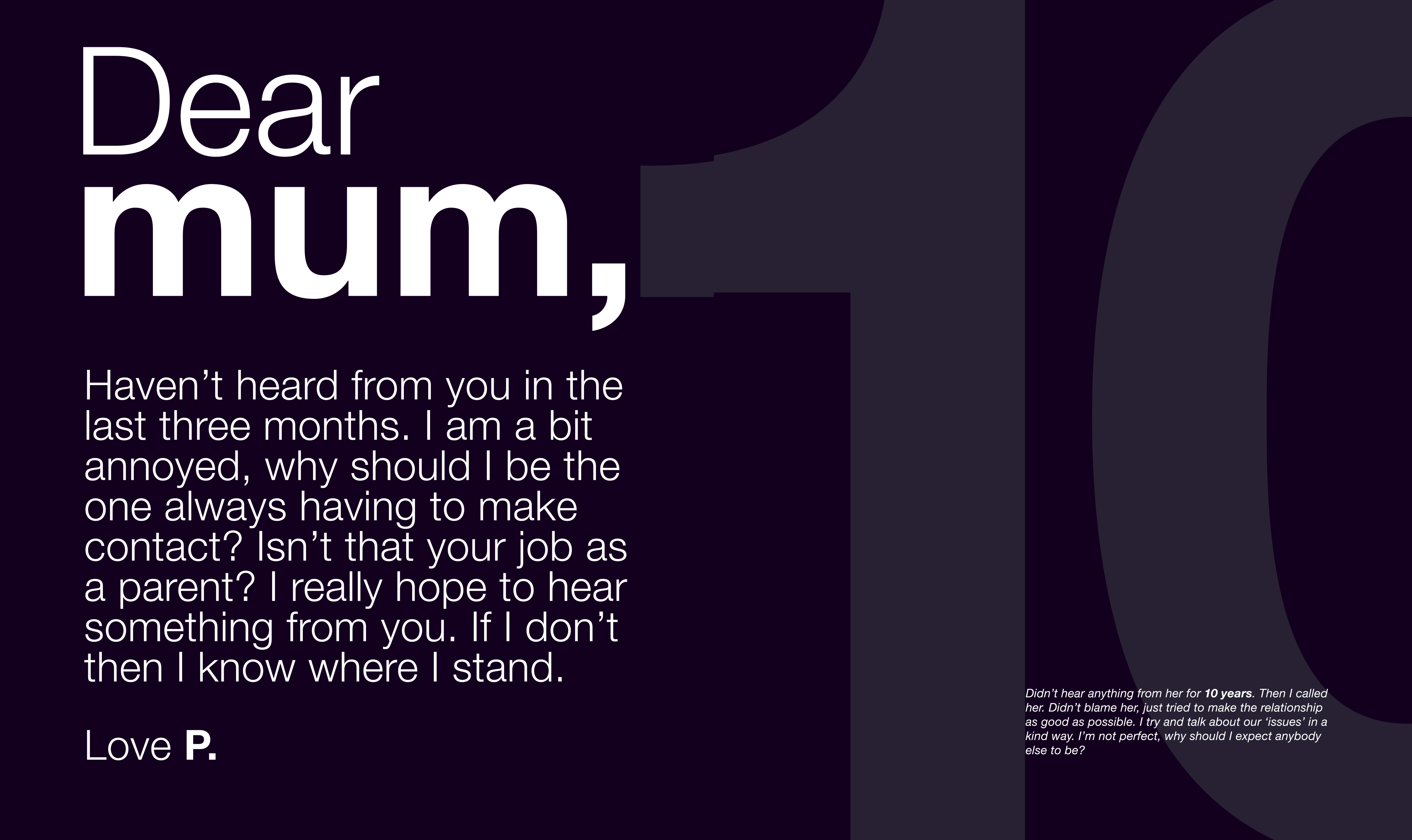 I started to ask around in my environment if there were people who had a letter to a parent lying around somewhere and who would like to share those with me. After trying and pushing for half a year, I managed to collect
